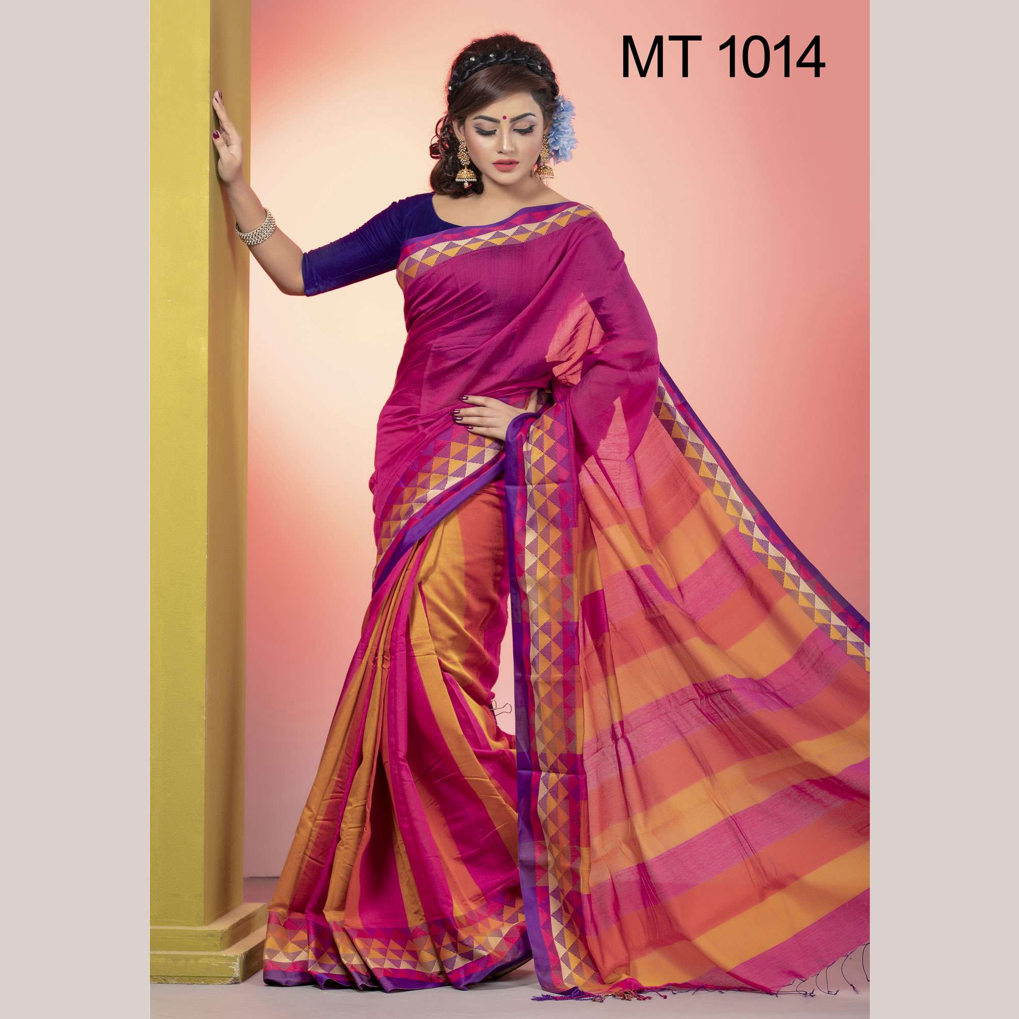 টাঙ্গাইল তাঁতের হাফ সিল্ক টেম্পল পাড় শাড়ী ব্লাউজ পিছ সহ (MT-1014)